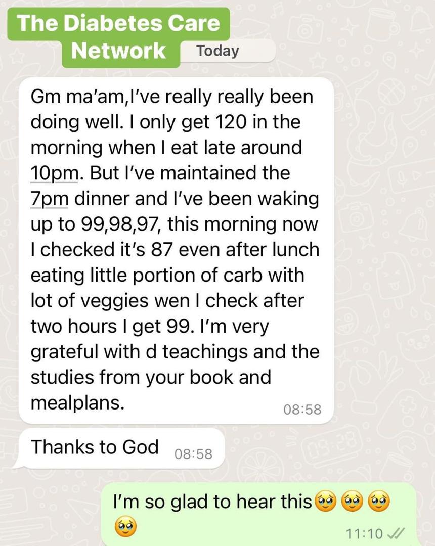I was scared when you asked me to stop my insulin because I was reacting to it and modified my prescriptions with your meal plan. Thank you for the close monitoring and constant check up. I promise not to stop all you have taught me. My fasting blood sugar level was 86 this morning
