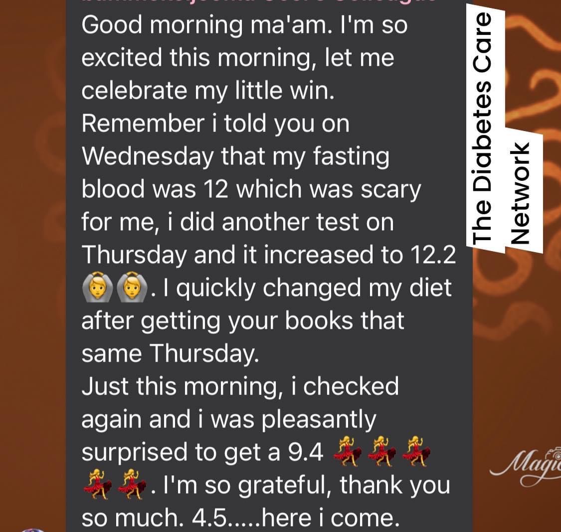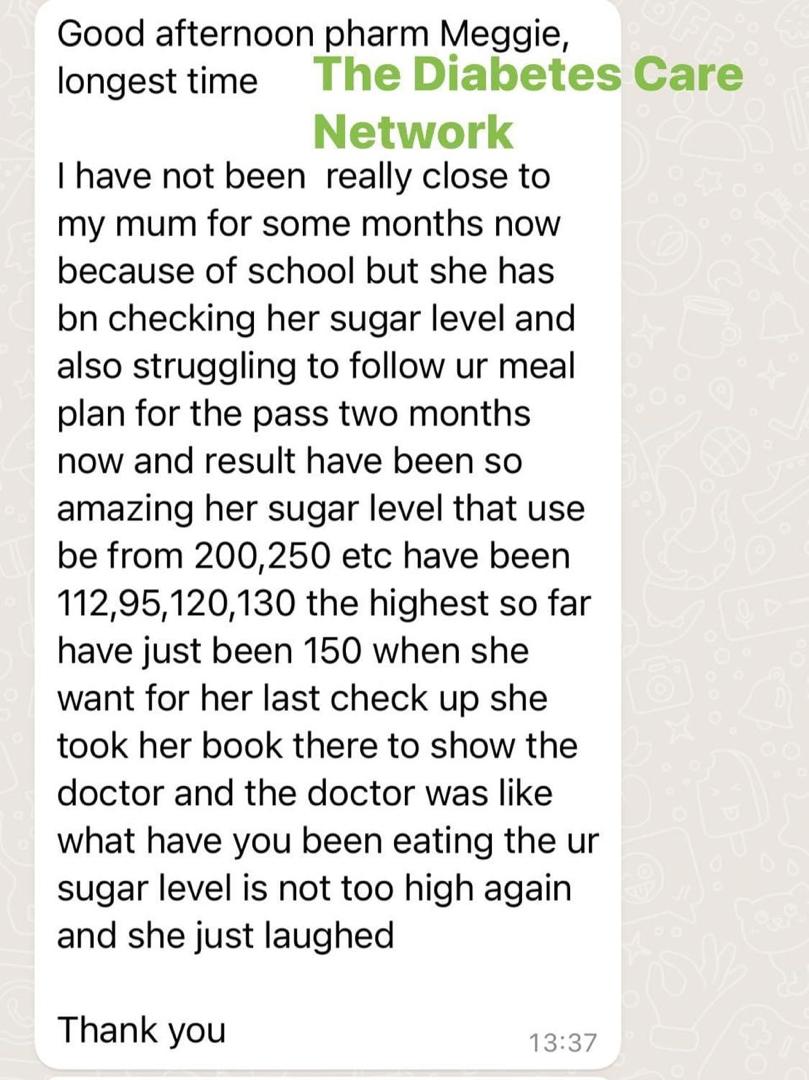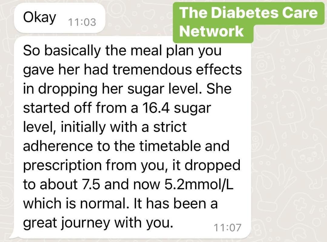 So basically the meal plan you gave her had tremendous effects in dropping her sugar level. She started off from a 16.4 sugar level, initially with a strict adherence to the timetable and prescription from you, it dropped to about 7.5 and now 5.2mmol/L which is normal. It has been a great journey with you.